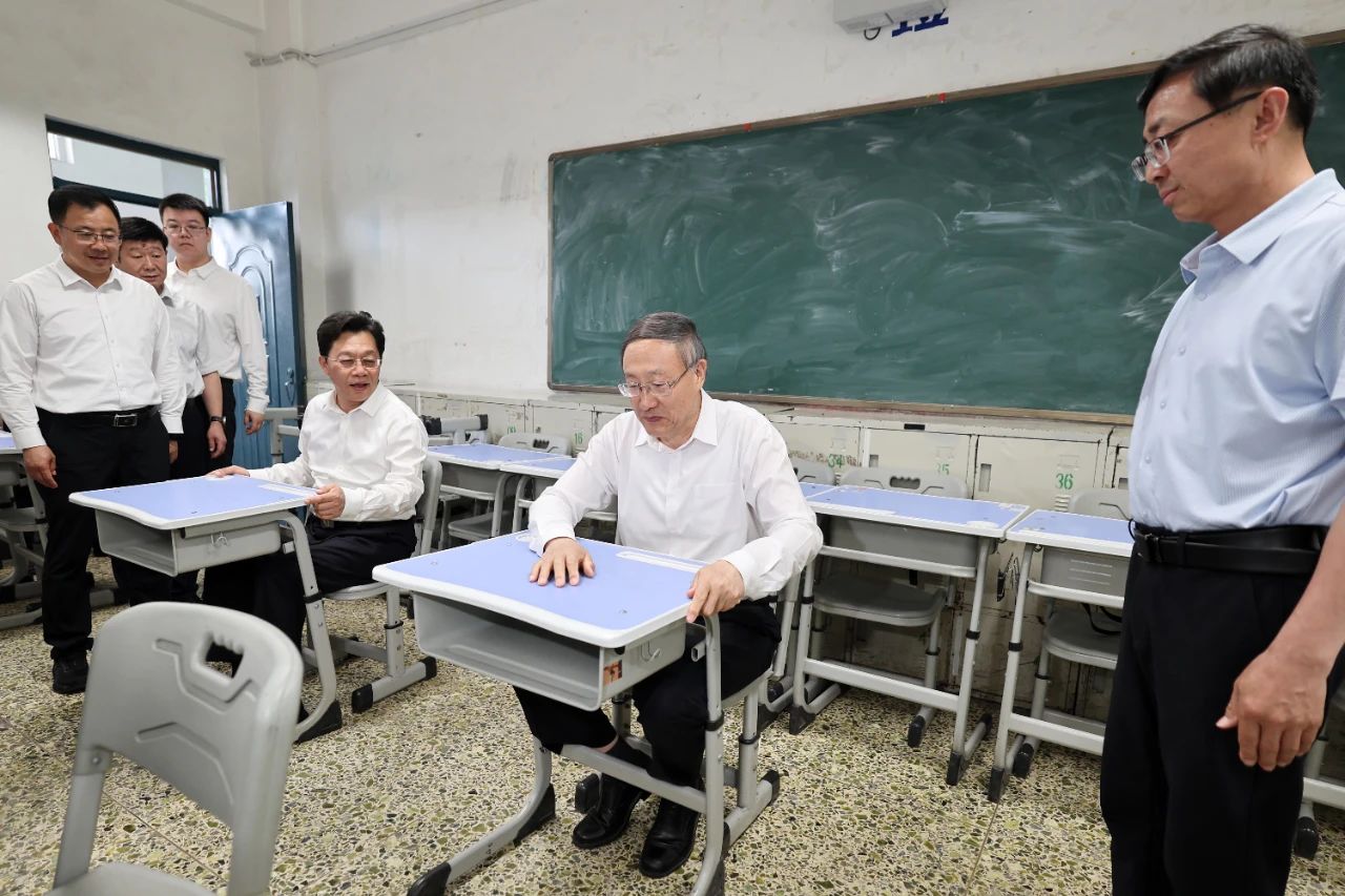 李邑飞、张雨浦在宁夏六盘山高级中学考场,体验桌椅入座舒适度。